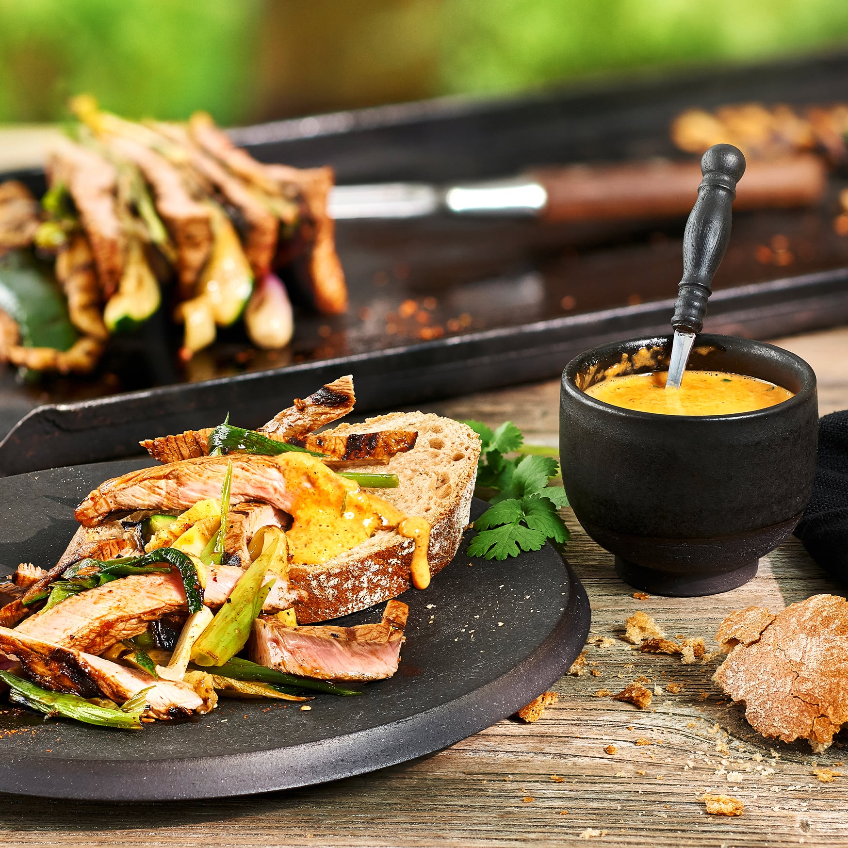 Traditionell wird Gyros aus Schweinefleisch hergestellt. Aber auch Kalbfleisch eignet sich wunderbar für dieses Gericht. In unserem Rezept wird das Fleisch zunächst über Nacht mariniert. Dann wird es gegrillt und mit Gemüse zu einem Turm geschichtet. Dieser wird mit einem Spieß oder einer Fleischgabel fixiert und dann können dünne Scheiben abgeschnitten werden. Dazu frisches Brot und ein Paprika-Dip – fertig ist ein köstliches Mittag- oder Abendessen.