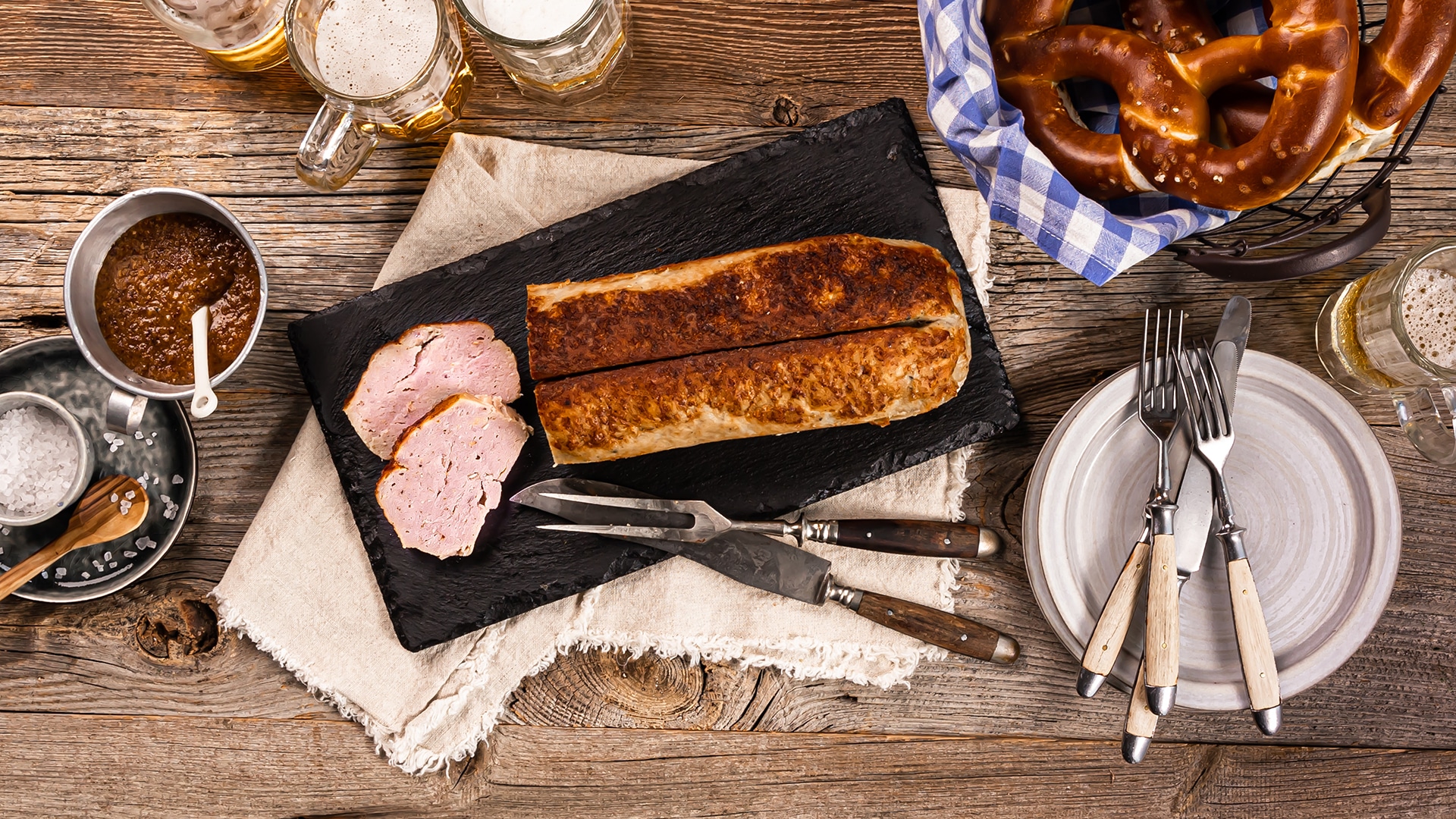 Leberkäse hat eine zarte Konsistenz und schmeckt durch Zugabe und Gewürzen wie Salz, Pfeffer, Muskat oder Kardamom schön würzig.